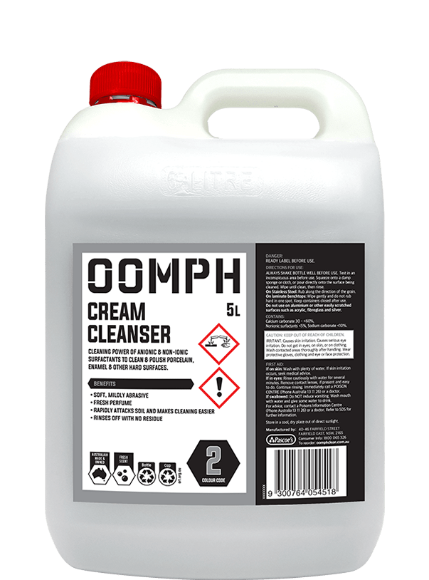 OOMPH Cream Cleanser is a cleanser for use in cleaning and polishing porcelain, enamel and other hard surfaces. It’s a specially designed creamy cleanser that combines the cleaning power of anionic and non-ionic surfactants (detergents), builders and buffers (to attack fatty materials) with a mildly abrasive polishing agent to help gently scour the soils and stains off the surface being cleaned. It also contains small amounts of perfume and preservative.